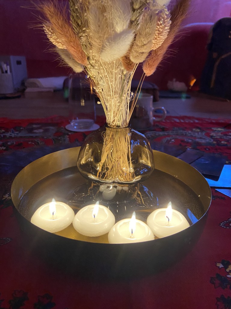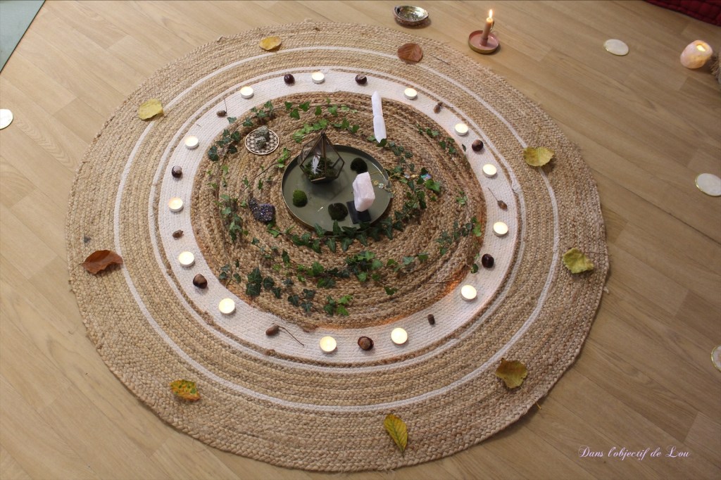 Au centre du cercle, tu trouveras souvent un autel qui sera créé en fonction de la thématique du moment. Tu y trouveras également des cartes ou images qui peuvent te permettre de t’inspirer ou de te découvrir.